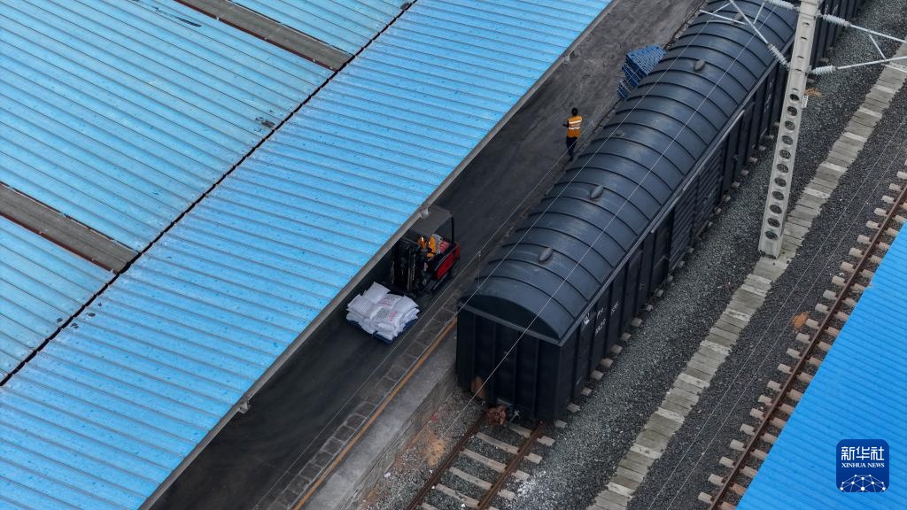 2月8日,在中国铁路成都局集团有限公司改貌站货场,工作人员在装卸化肥(无人机照片)。