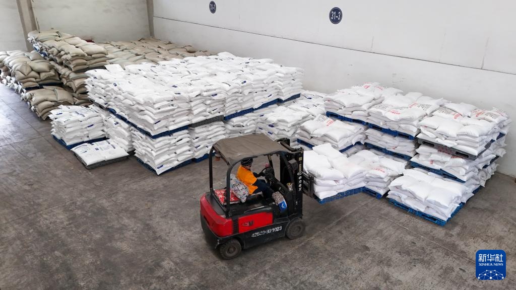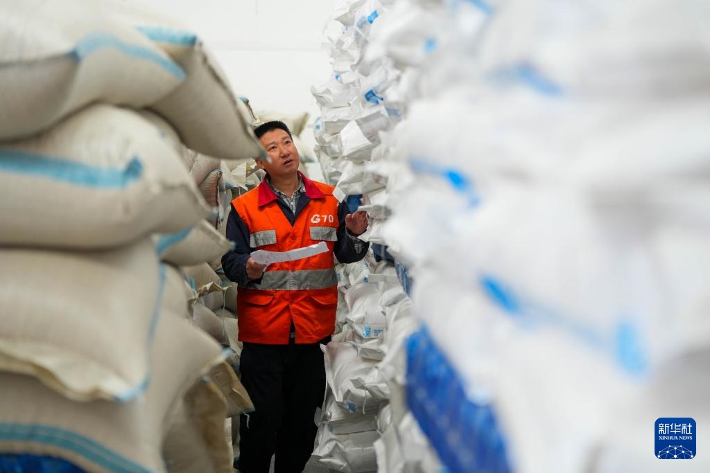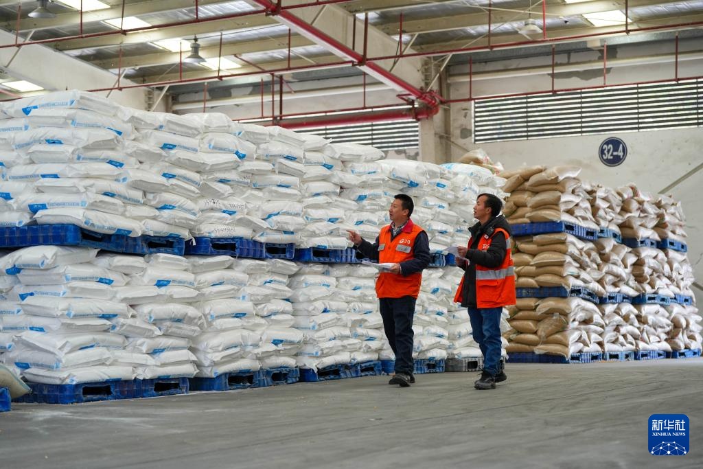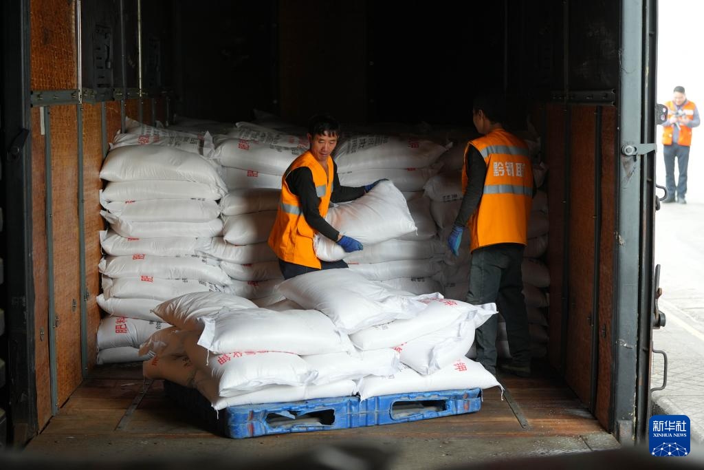2月8日,在中国铁路成都局集团有限公司改貌站货场,工作人员在清点春耕物资。