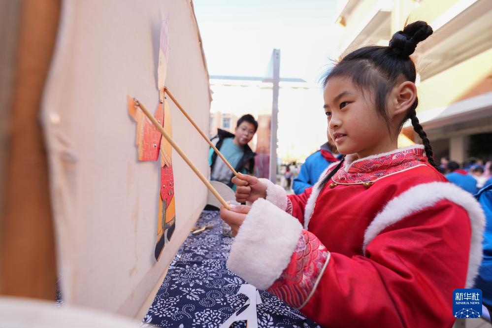 2月9日,在长沙市仰天湖桂花坪小学,小朋友在体验表演皮影戏。