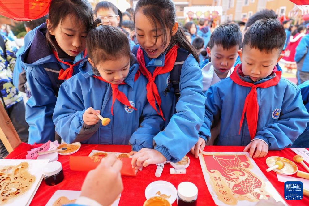 2月9日,在长沙市仰天湖桂花坪小学,小朋友在体验拓印。