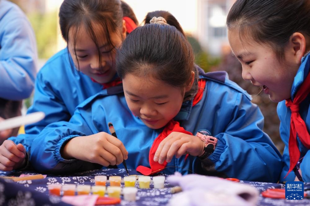 2月9日,在长沙市仰天湖桂花坪小学,小朋友在体验掐丝釉彩制作技艺。