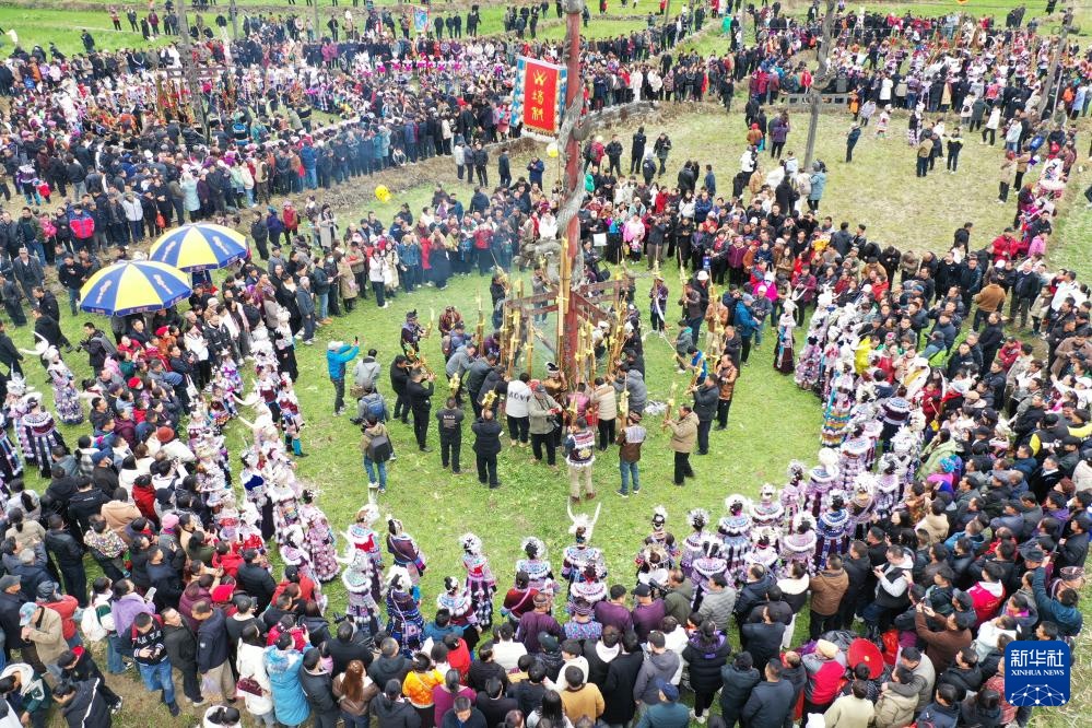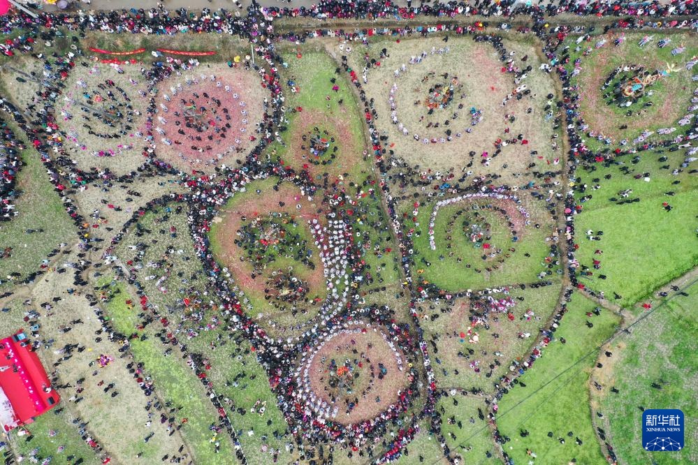 2月10日,在柳州市融水苗族自治县安太乡“十三坡会”上,各族群众共跳芦笙踩堂舞(无人机照片)。