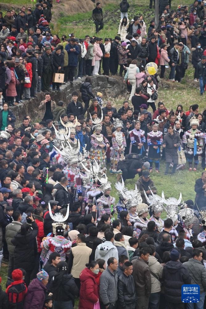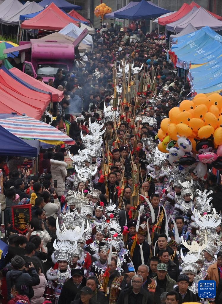 2月10日,在柳州市融水苗族自治县安太乡“十三坡会”,各族群众共跳芦笙踩堂舞。