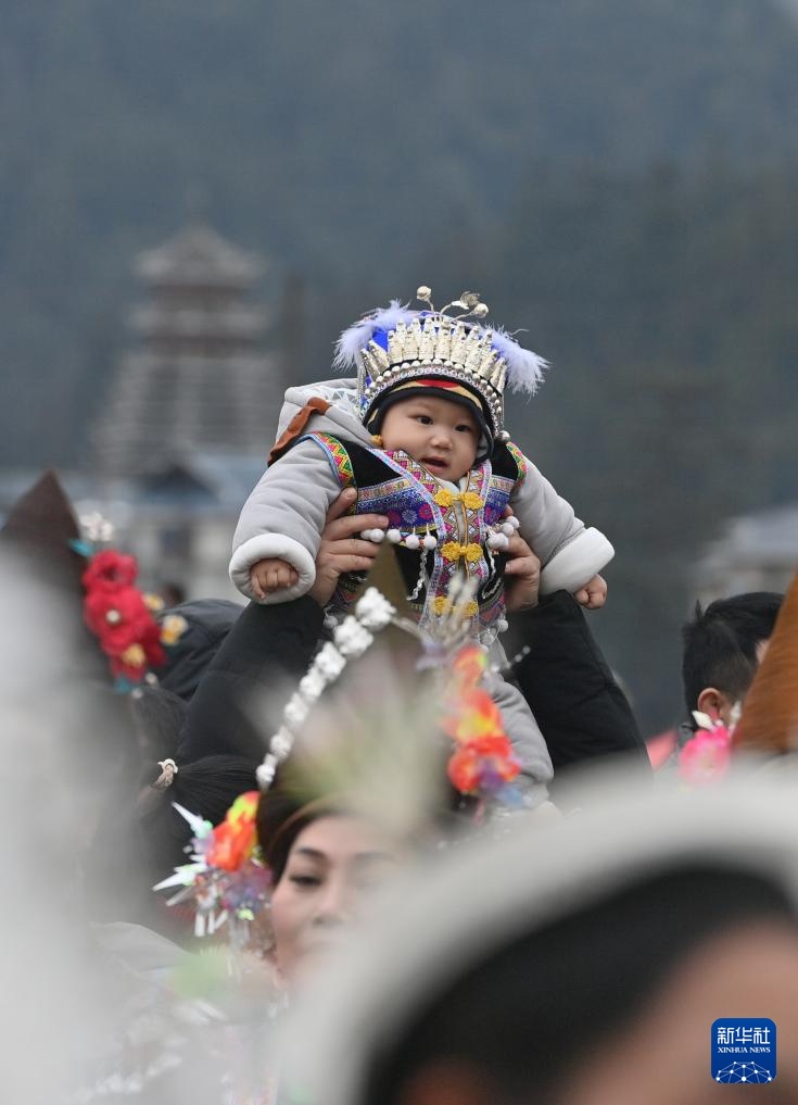 2月10日,小朋友在柳州市融水苗族自治县安太乡“十三坡会”上观看芦笙踩堂舞表演。