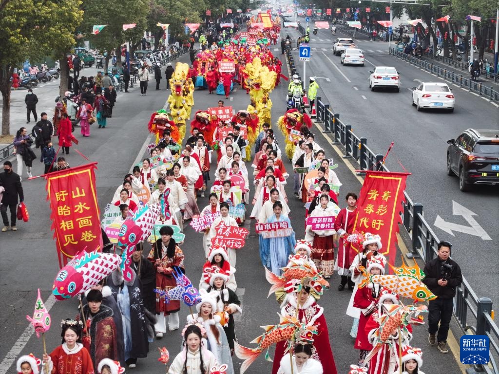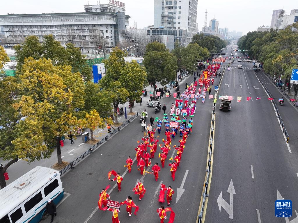2月11日,展演队伍在盱眙县的道路上巡游(无人机照片)。