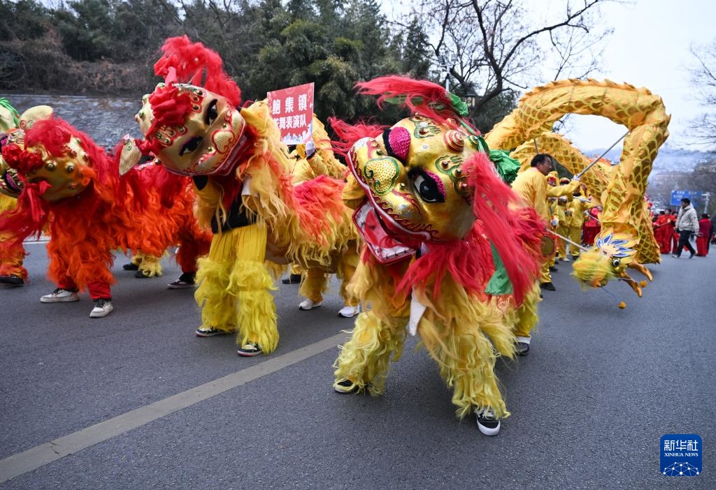 2月11日,舞龙舞狮队在盱眙县城市道路上巡游。