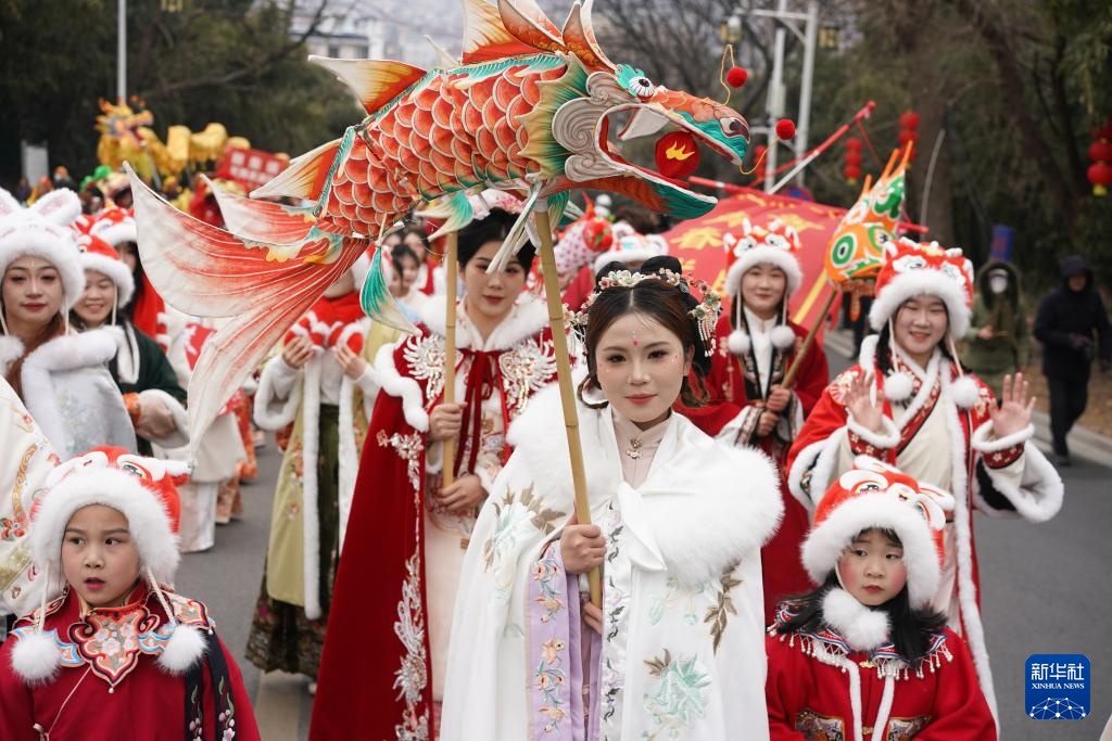 当日,江苏省盱眙县举行元宵节民俗汇演活动。13支队伍在城市道路进行巡游。舞龙舞狮、秧歌舞、渔鼓舞等精彩纷呈的节目为城市营造出浓浓的元宵佳节氛围。