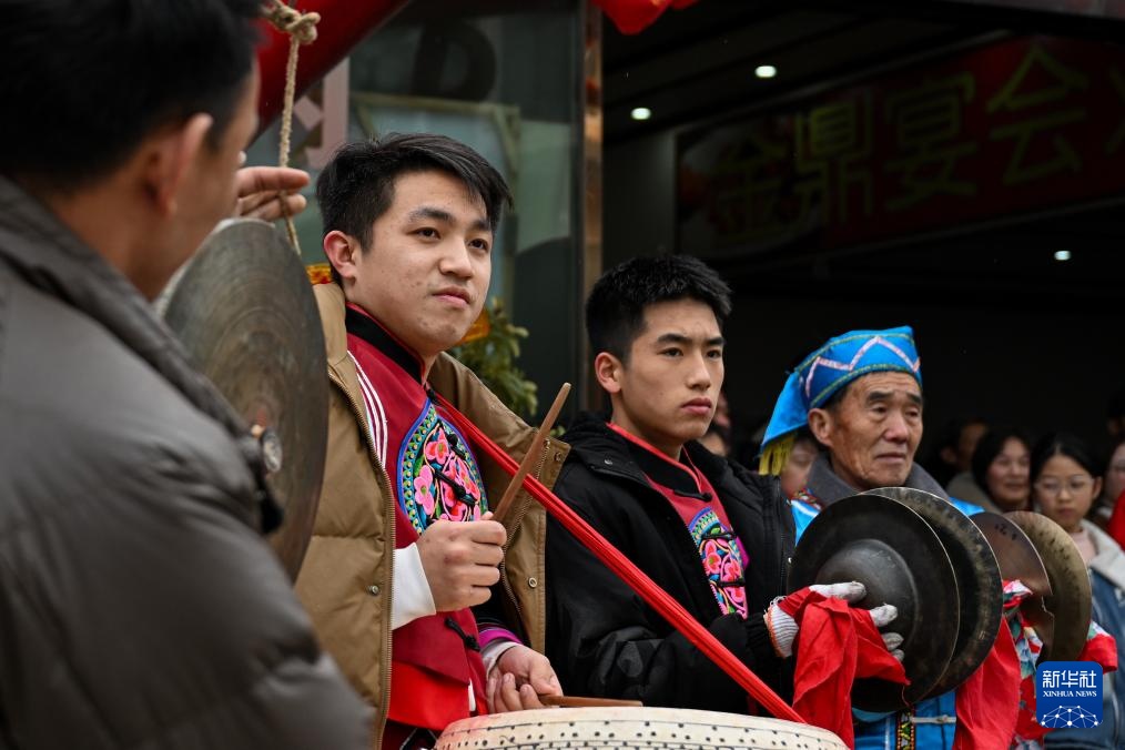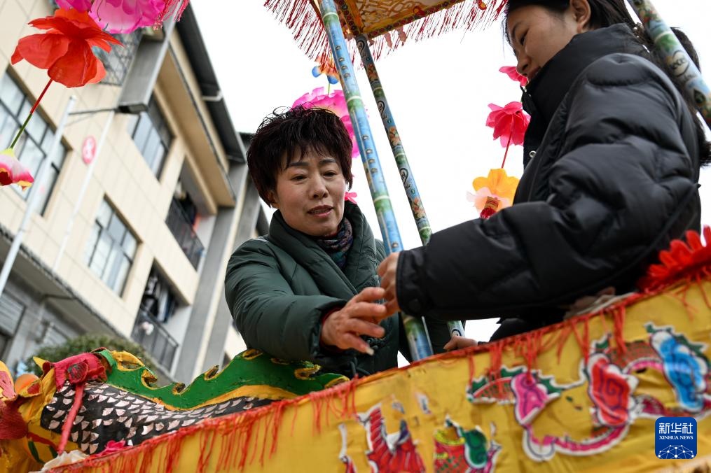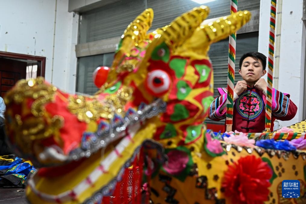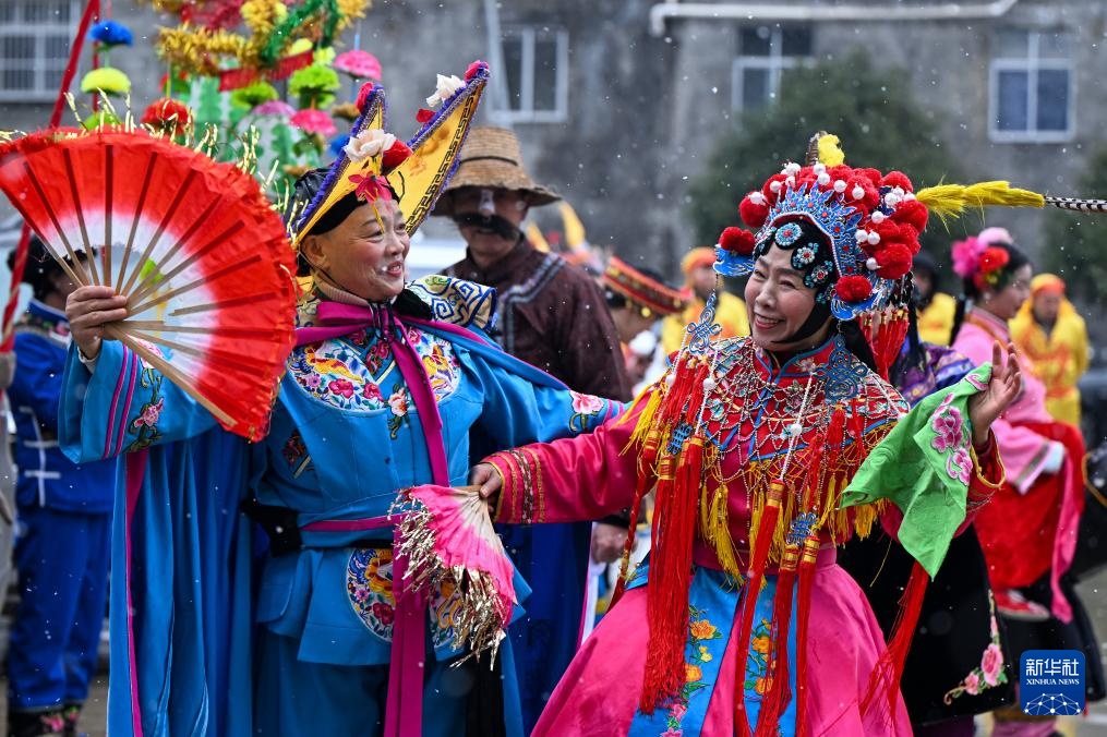 2月6日,在湖北省恩施州利川市柏杨坝镇,灯歌队队员在演出前穿戴衣饰。
