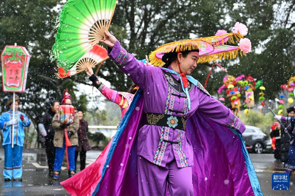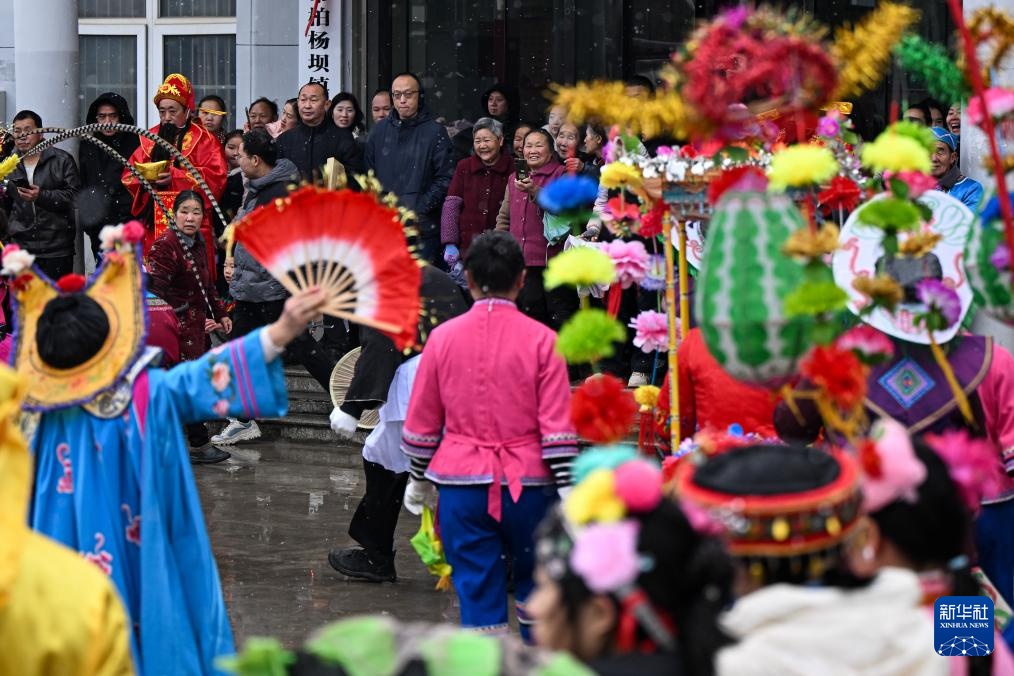 2月6日,在湖北省恩施州利川市柏杨坝镇,灯歌队在表演灯歌。