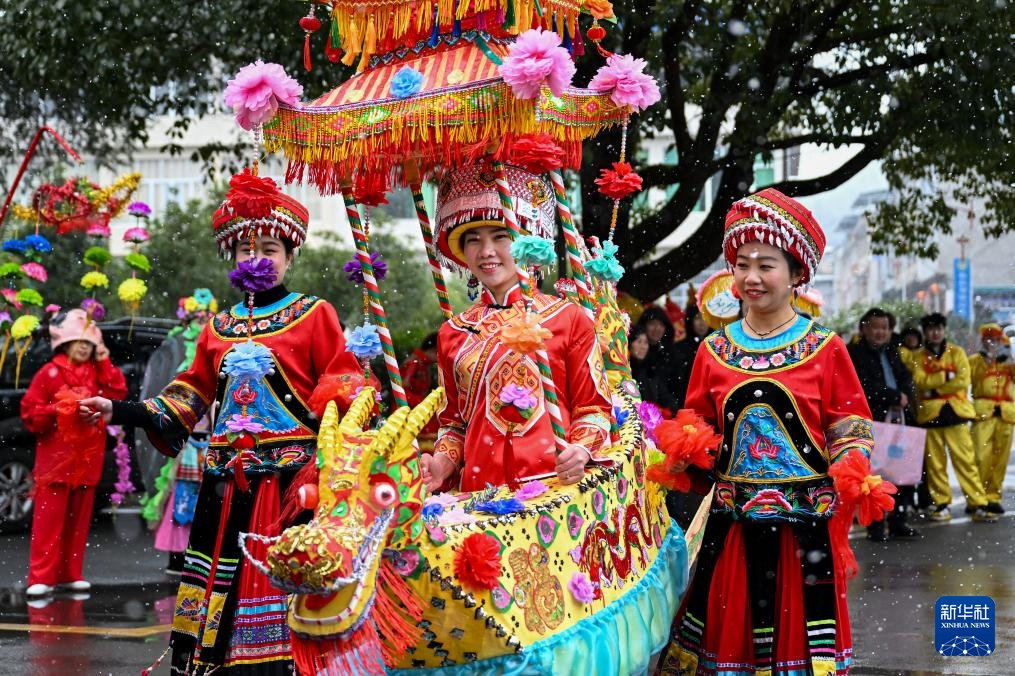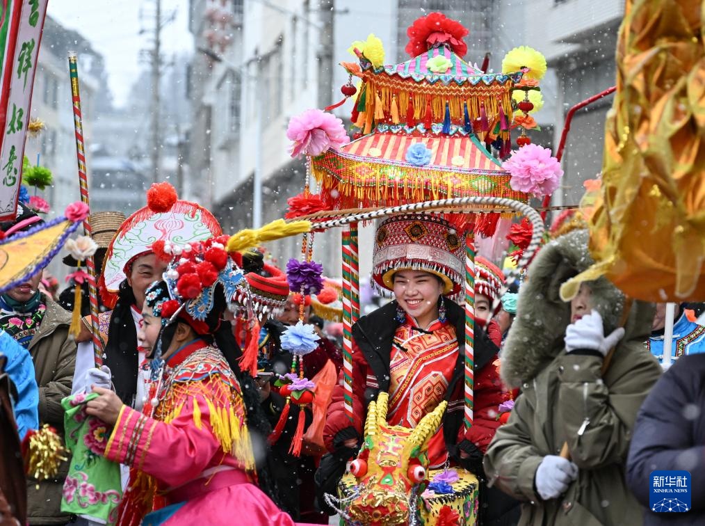 2月6日,在湖北省恩施州利川市柏杨坝镇,灯歌队在街头巡游表演。