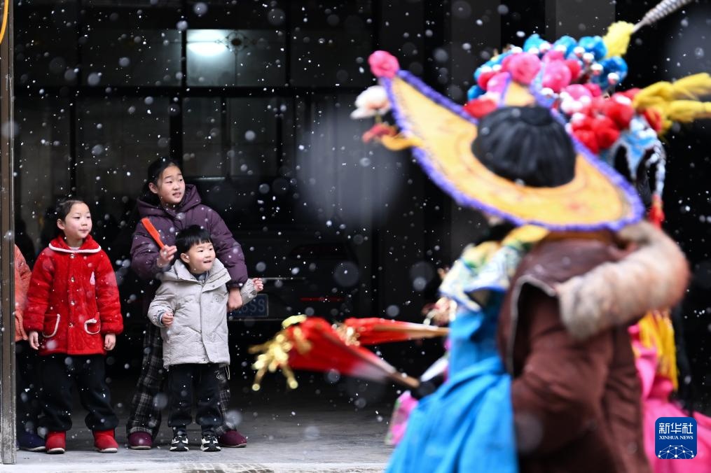 2月6日,在湖北省恩施州利川市柏杨坝镇,人们在街边观看灯歌表演。