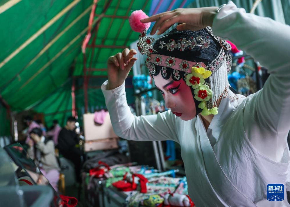 2月11日,建德婺剧团演员在金华市金东区鞋塘办事处金家村为演出做准备。