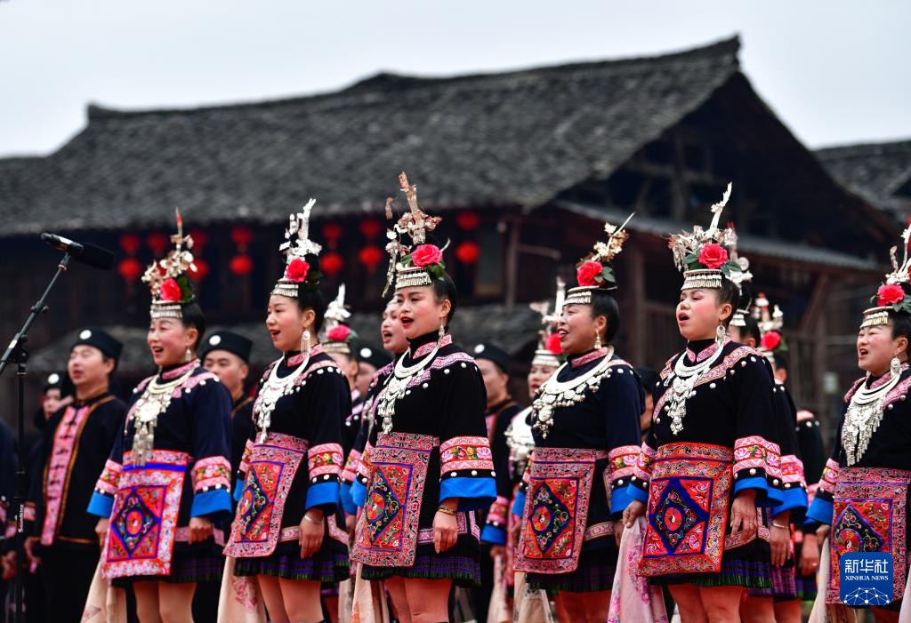 2月11日,少数民族同胞在贵州省锦屏县隆里古城举办的“村晚”活动中演唱民族歌曲。