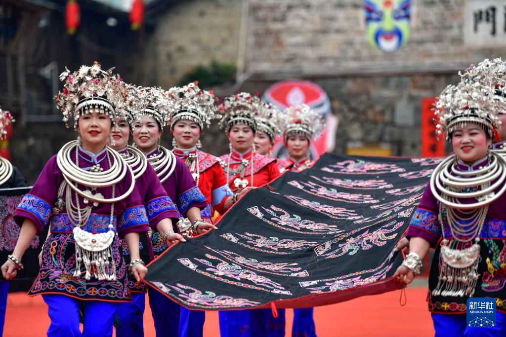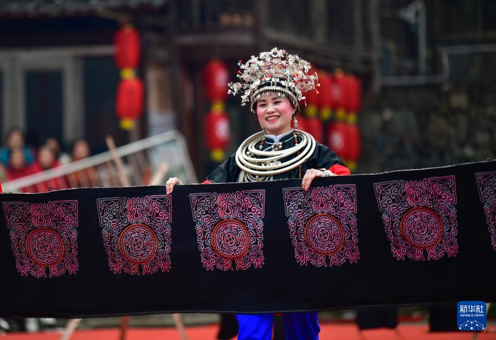 2月11日,少数民族同胞在贵州省锦屏县隆里古城举办的“村晚”活动中展示民族刺绣。