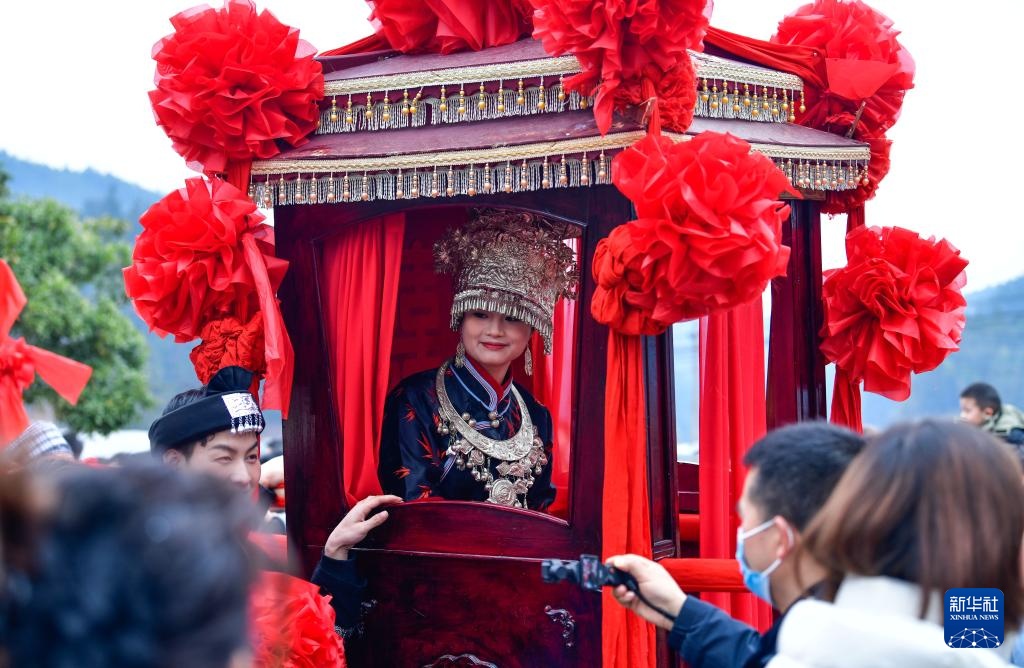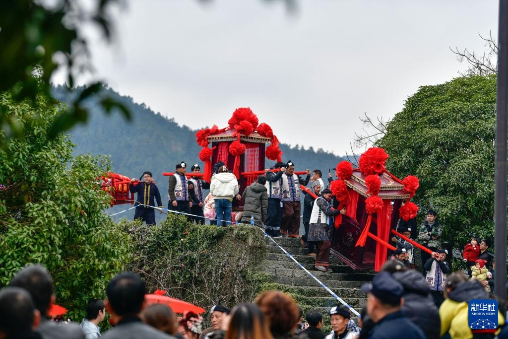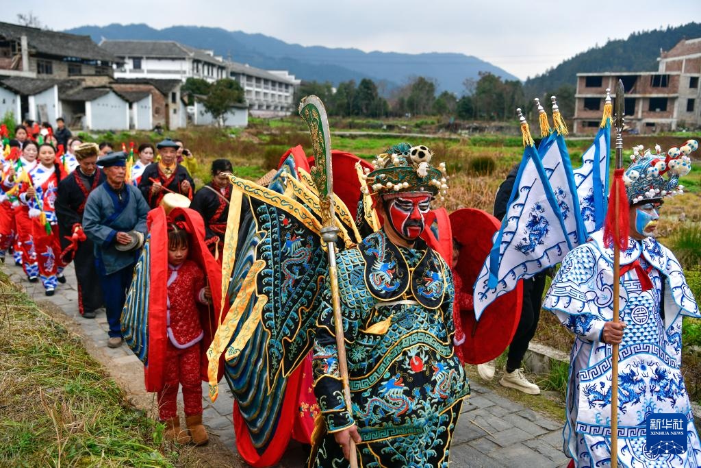 2月11日,迎亲表演队在贵州省锦屏县隆里古城参加“村晚”巡游活动。
