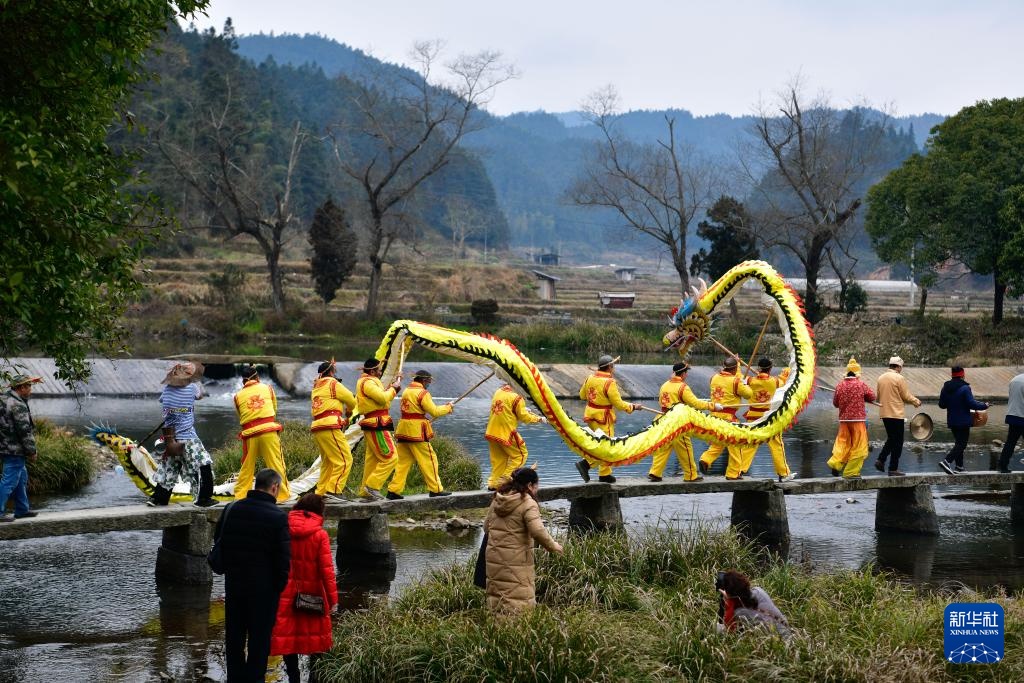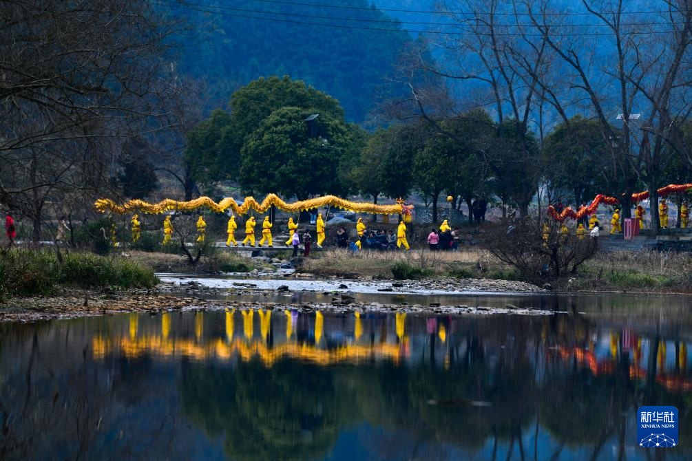 2月11日,人们在贵州省锦屏县隆里古城举办的“村晚”巡游活动中舞龙。