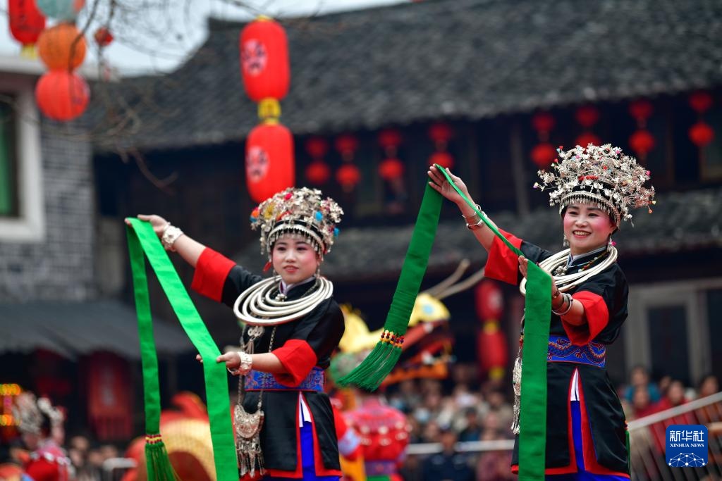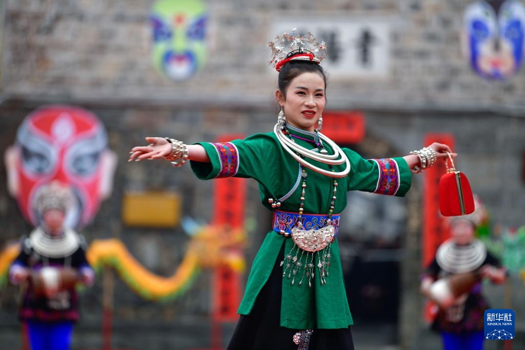 2月11日,演员在贵州省锦屏县隆里古城举办的“村晚”活动中展示民族服饰。