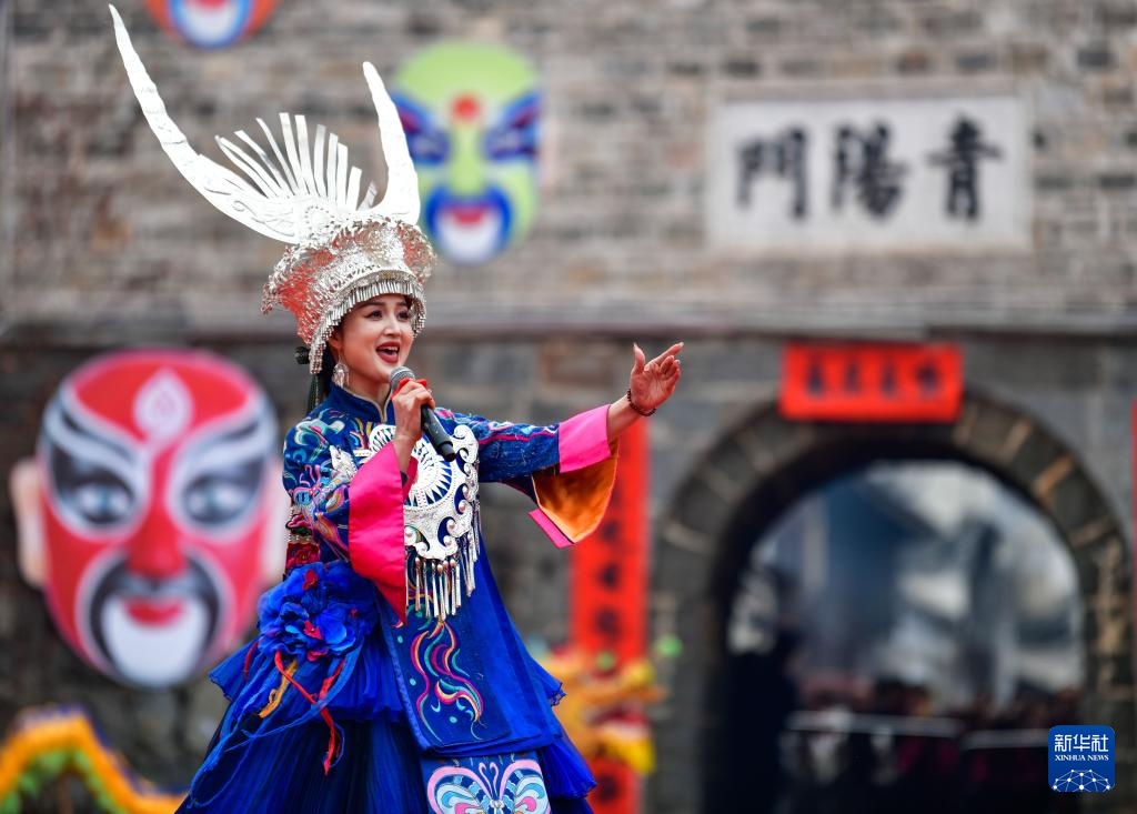 2月11日,苗族歌手在贵州省锦屏县隆里古城举办的“村晚”活动中演唱歌曲。