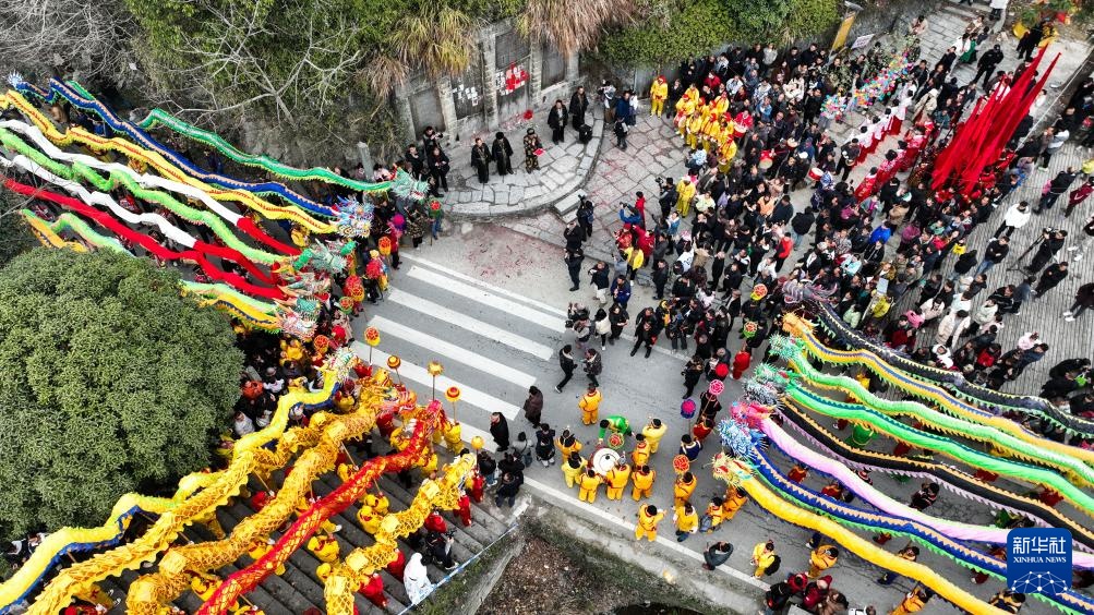 2月11日,人们在贵州省锦屏县隆里古城举办的“村晚”巡游活动中舞龙(无人机照片)。