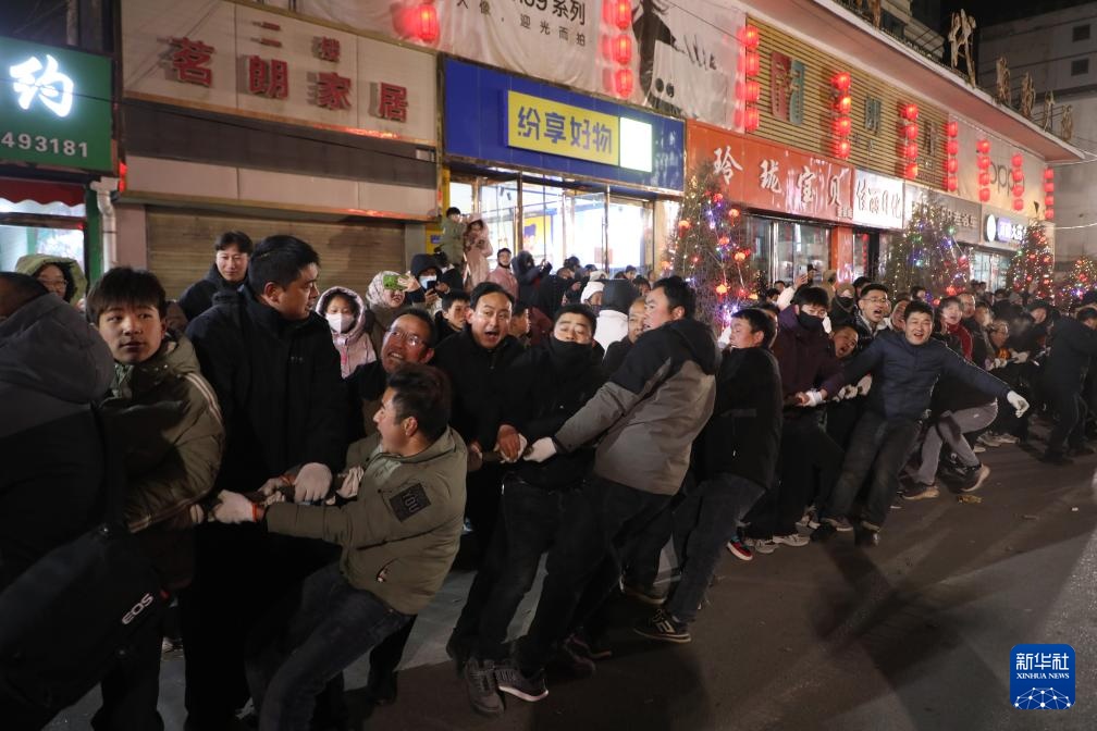 当晚,2025年元宵节“万人扯绳”民俗活动在甘肃省甘南藏族自治州临潭县城关镇西大街举行,数万名各族群众在一根长度超过1800米的钢绳两侧角力竞技、呐喊加油。