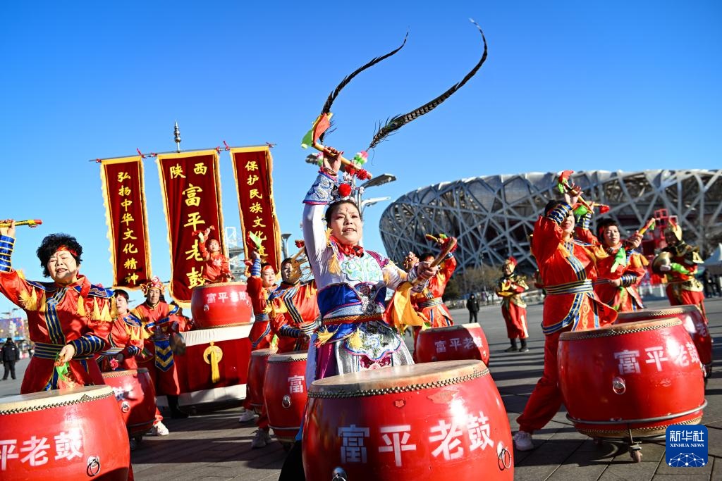 2月12日,“鸟巢”前的老庙老鼓展演吸引众多游人观看。