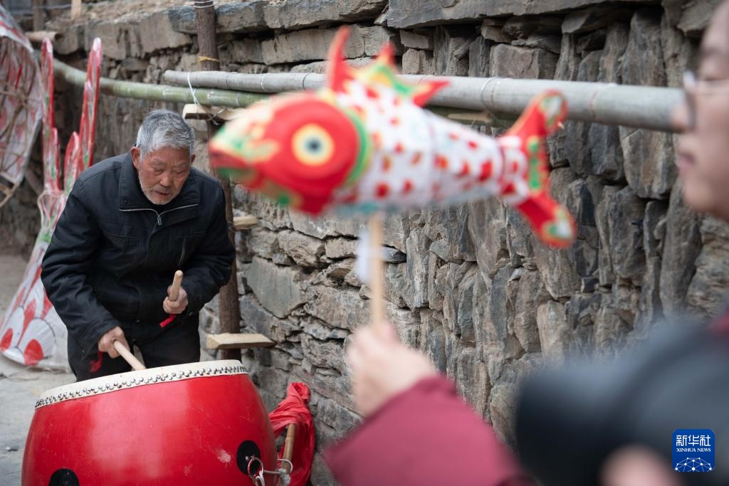 2月10日,在安徽省黄山市歙县溪头镇汪满田村,村民在嬉鱼灯前练习打鼓。