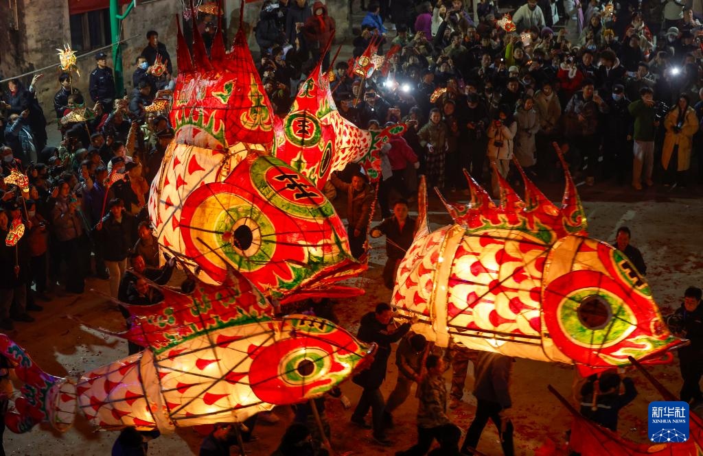 2月10日晚,村民在安徽省黄山市歙县溪头镇汪满田村嬉鱼灯。