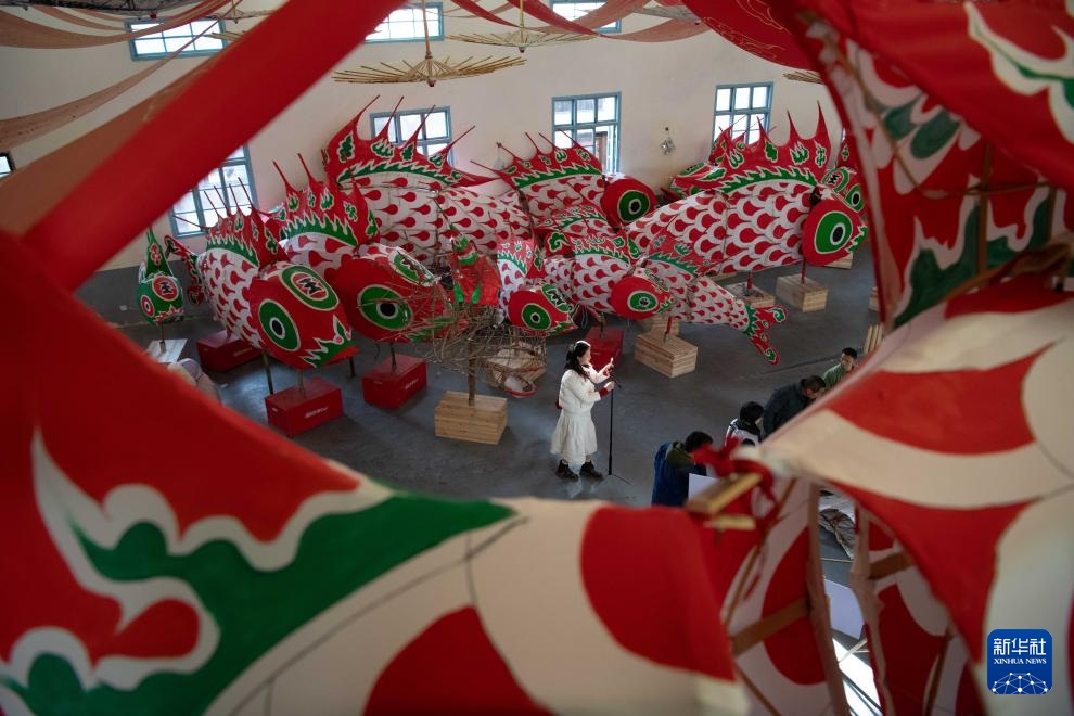 2月10日,在安徽省黄山市歙县溪头镇汪满田村,村民汪春燕在一处祠堂内制作鱼灯。
