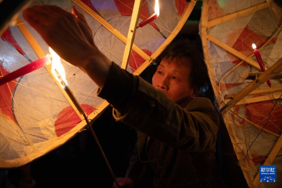 2月10日晚,在安徽省黄山市歙县溪头镇汪满田村,村民点燃鱼灯内的蜡烛。