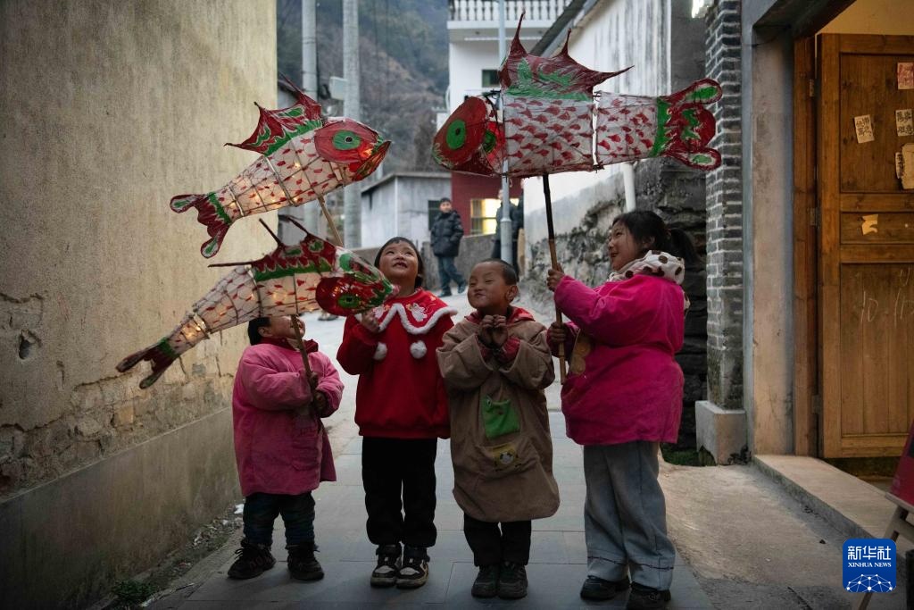 2月10日,在安徽省黄山市歙县溪头镇汪满田村,小朋友手持鱼灯留影。