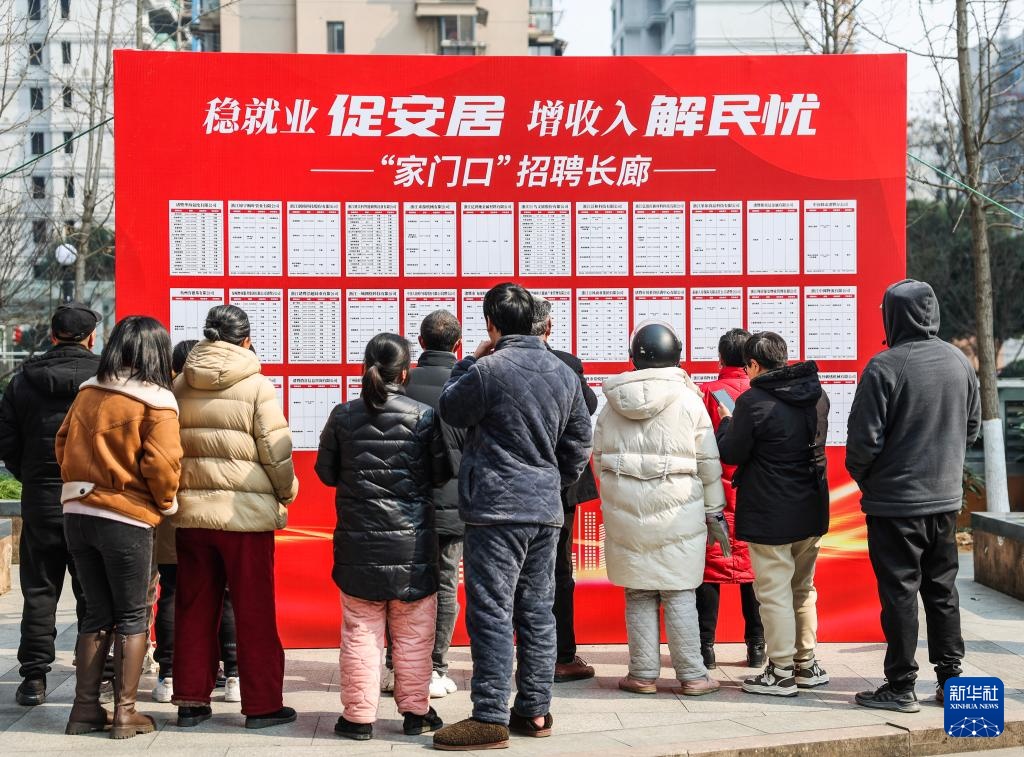 2月13日,公租房小区居民在查看专场招聘会推出的岗位介绍。