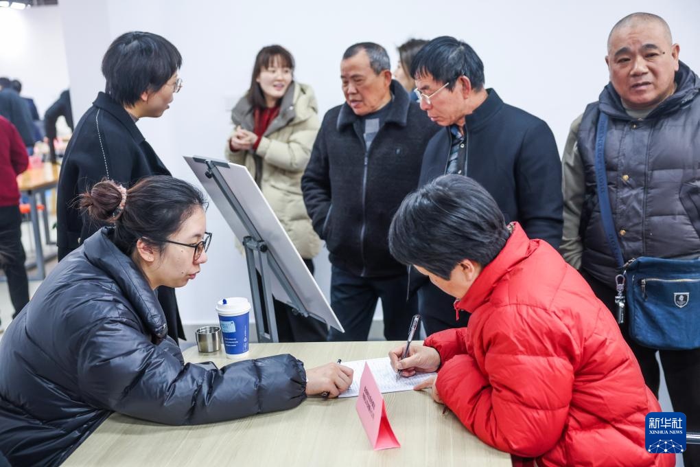 2月13日,在公租房小区春节专场招聘会上,应聘者填写表格。