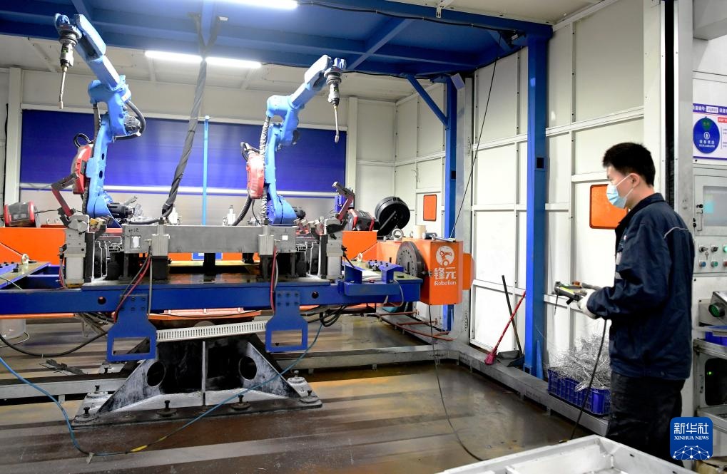 2月13日,在福建祥鑫新能源汽车配件制造有限公司托盘自动化焊接车间,技术人员使用自动化机器人焊接设备焊接新能源汽车电源托盘。