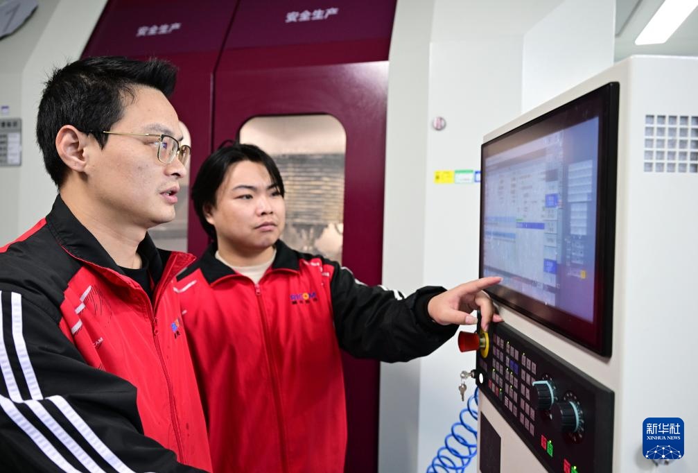 2月12日,在福建福光股份有限公司的大型光学镜片研磨车间里,技术人员使用电脑自动化研磨设备生产大规格光学镜片。
