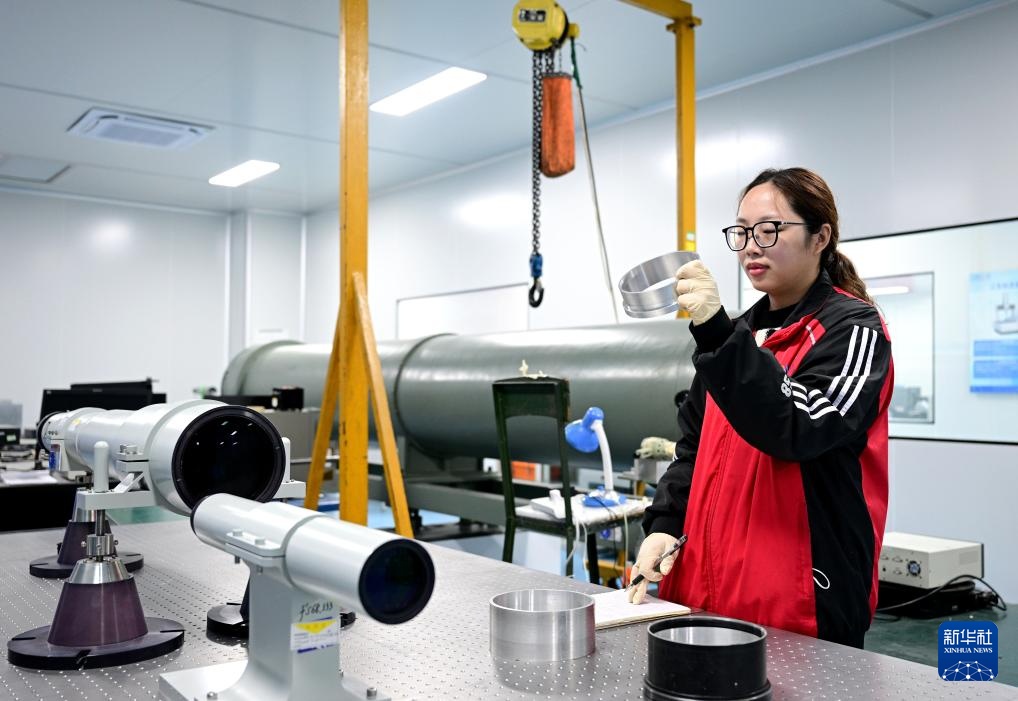2月12日,在福建福光股份有限公司的超精密加工与检验实验室里,技术人员在检测光学镜筒。
