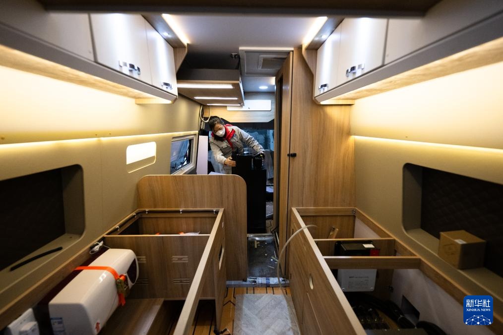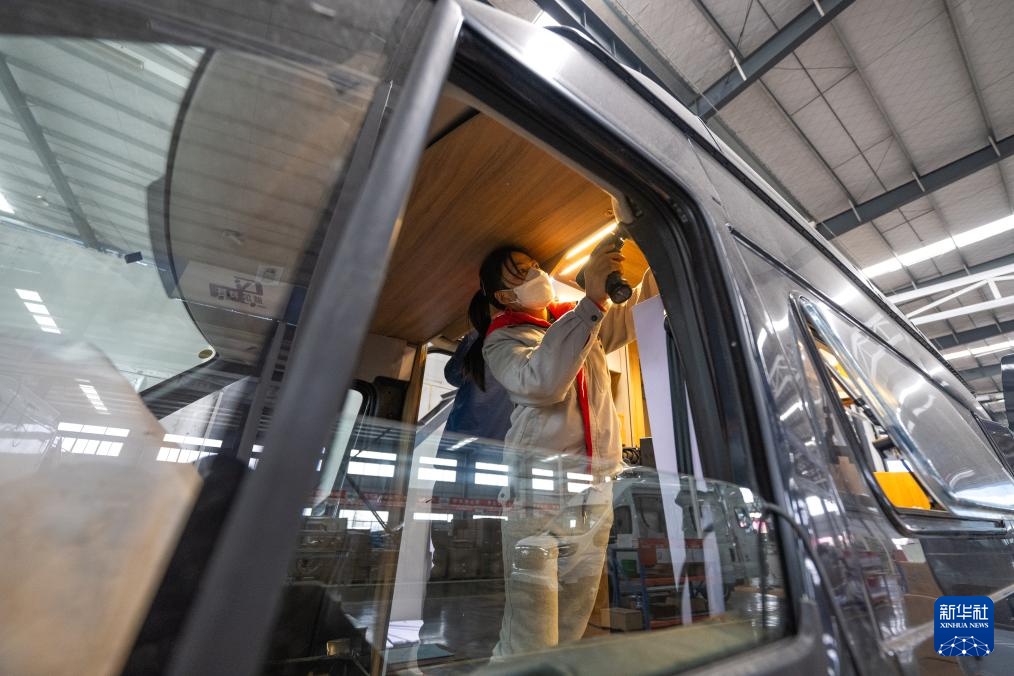 2月14日,工人在湖北威尔特芬房车科技有限公司总装车间进行装配作业。