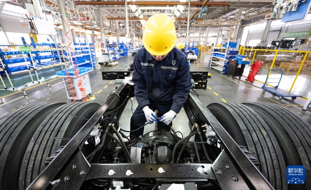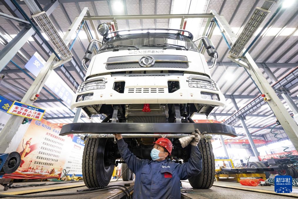 2月13日,工人在程力专用汽车股份有限公司新能源商用车底盘装配线上作业。