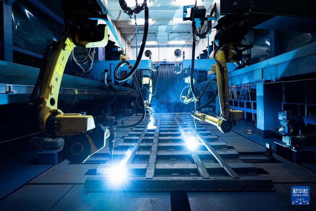 2月13日,工业机器人在中国重汽集团湖北华威专用汽车有限公司自卸车智能化生产线上作业。