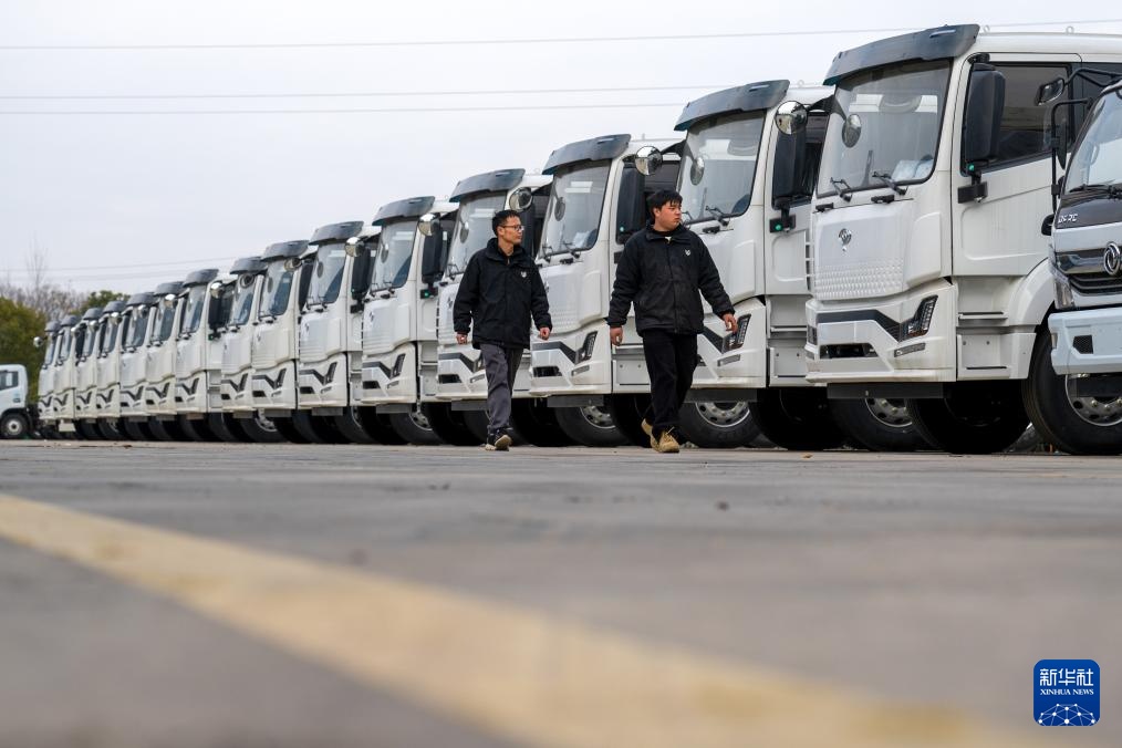 2月13日,工作人员在程力专用汽车股份有限公司下线的成品车前巡查。