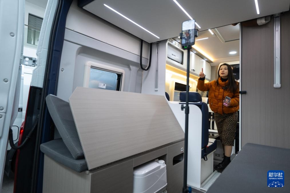 2月14日,主播在湖北威尔特芬房车科技有限公司的一款房车内进行直播推介。