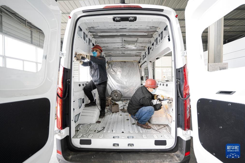 2月14日,工人在湖北威尔特芬房车科技有限公司底盘改造车间作业。