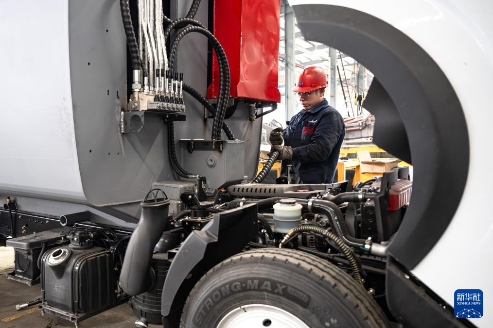 2月13日,工人在程力专用汽车股份有限公司环卫车厂生产线上作业。