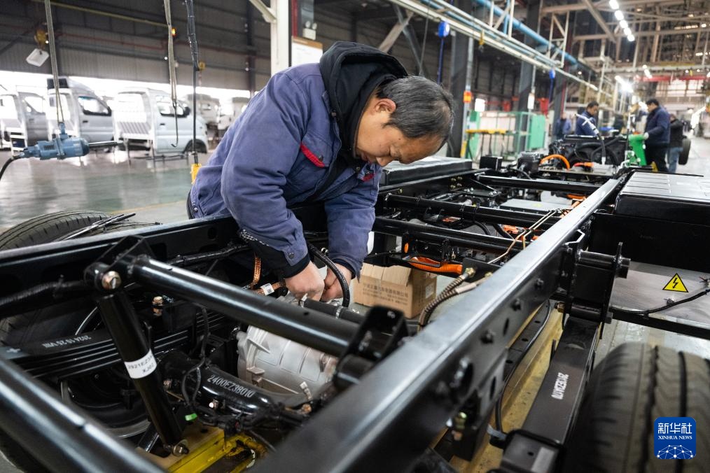 2月14日,在湖北新楚风汽车股份有限公司总装车间,工人对一台新能源载货车进行装配作业。