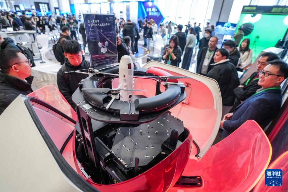 2月14日,观众在活动现场参观全自主无人机巡检系统。