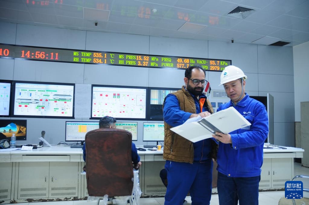 2月11日,在伊拉克瓦西特省,华事德电厂副厂长海德尔(右)在集控室了解机组运行情况。
