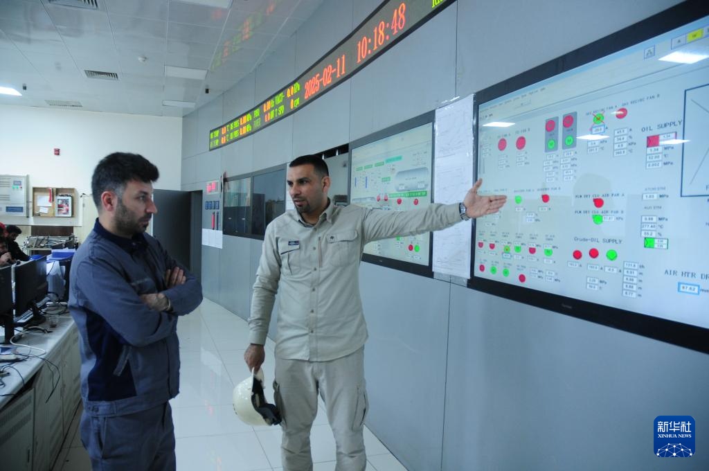 2月10日,在伊拉克瓦西特省,华事德电厂大修项目项目经理徐广江(右)在集控室了解机组运行情况。