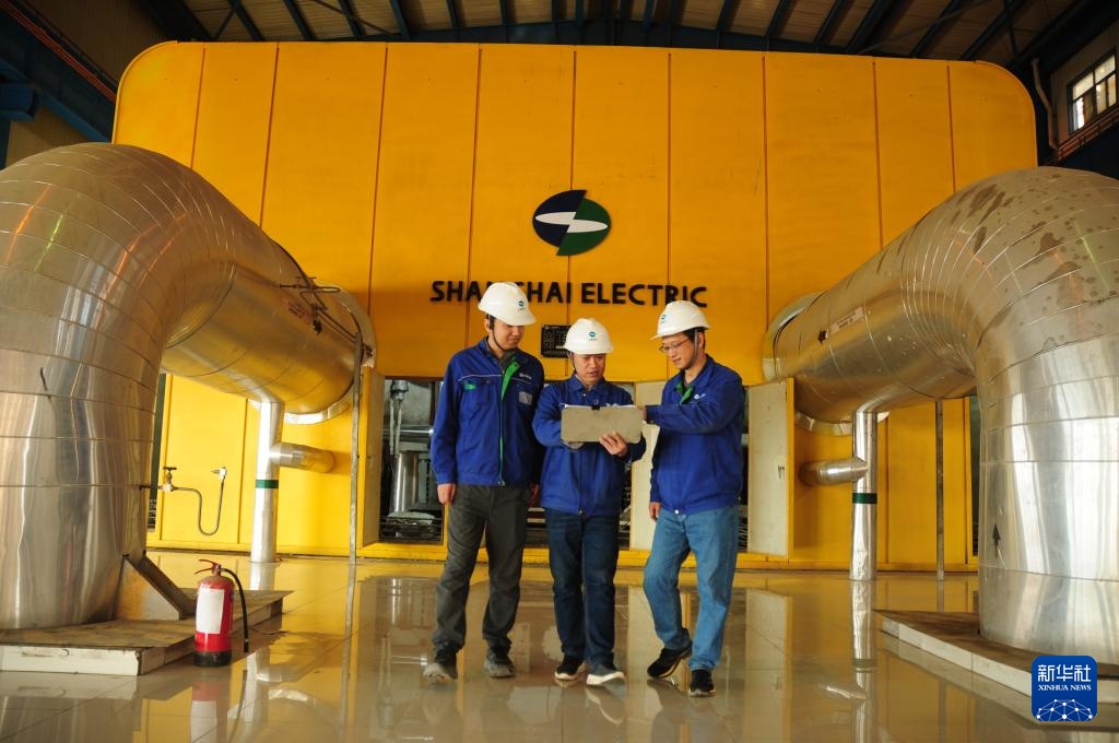 2月10日,在伊拉克瓦西特省,华事德电厂大修项目项目经理徐广江(中)和上海电气中方工程师在华事德电厂检查机组运行参数。