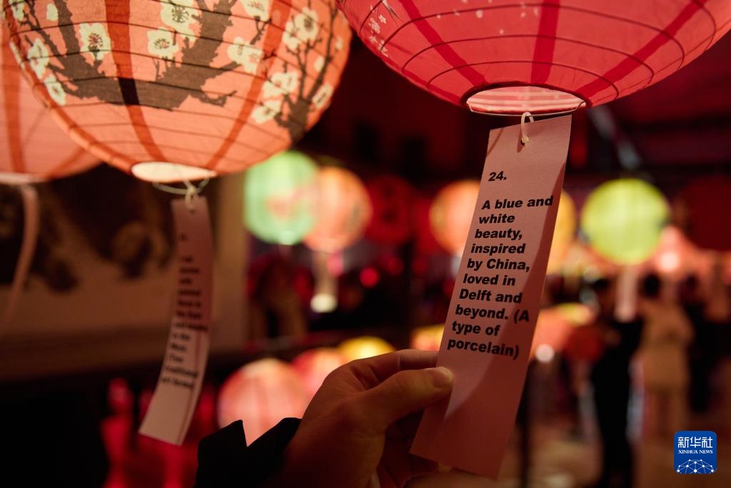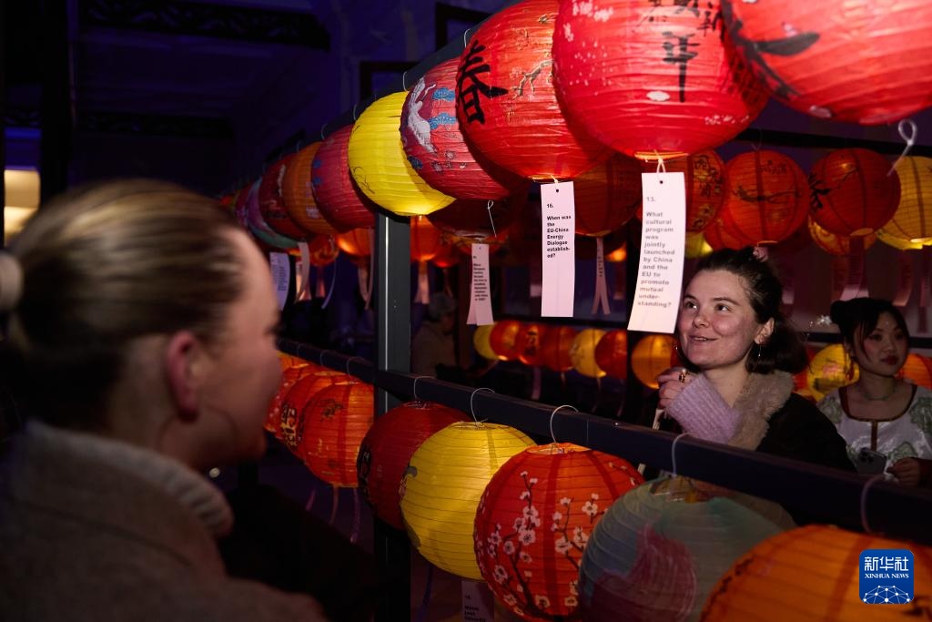 2月13日,观众在比利时布鲁塞尔皇家艺术与历史博物馆内猜灯谜。