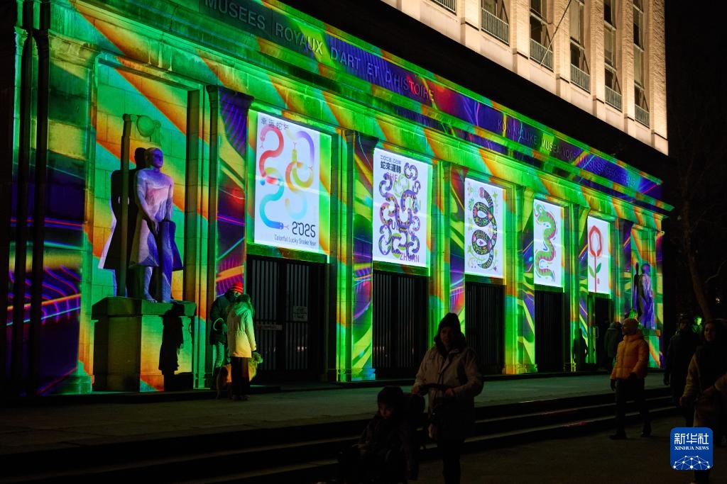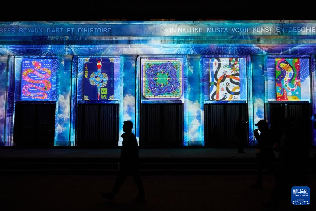 这是2月13日在比利时布鲁塞尔拍摄的投影在皇家艺术与历史博物馆幕墙上的蛇年生肖设计大赛优秀作品。