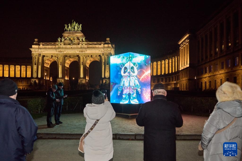 2月13日,观众在比利时布鲁塞尔五十周年纪念公园外欣赏创意作品“人工智能大熊猫”。
